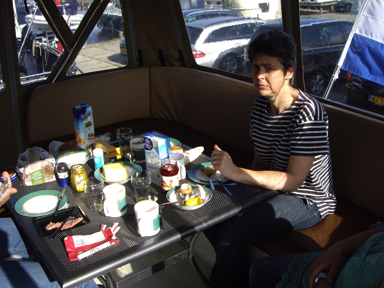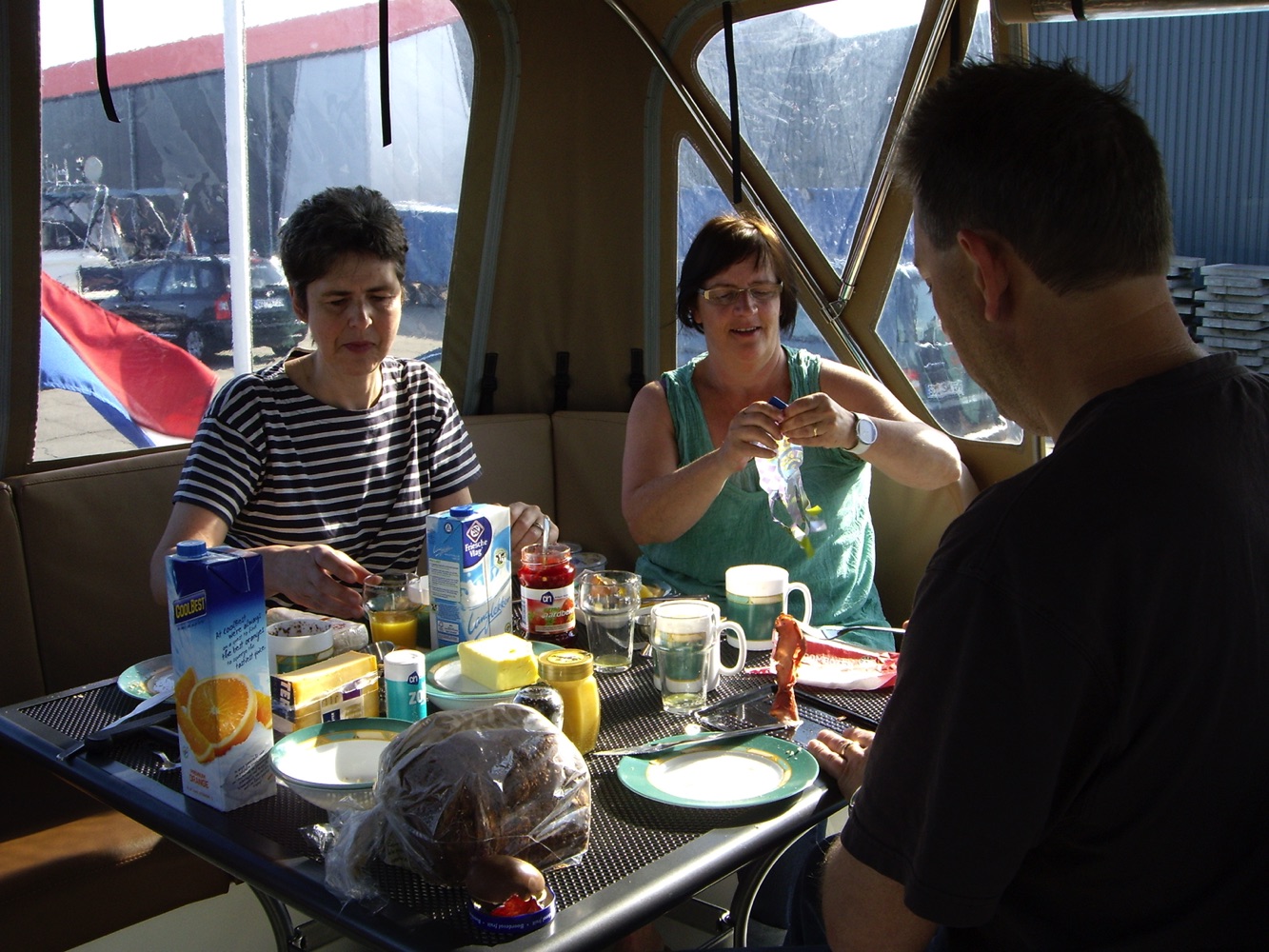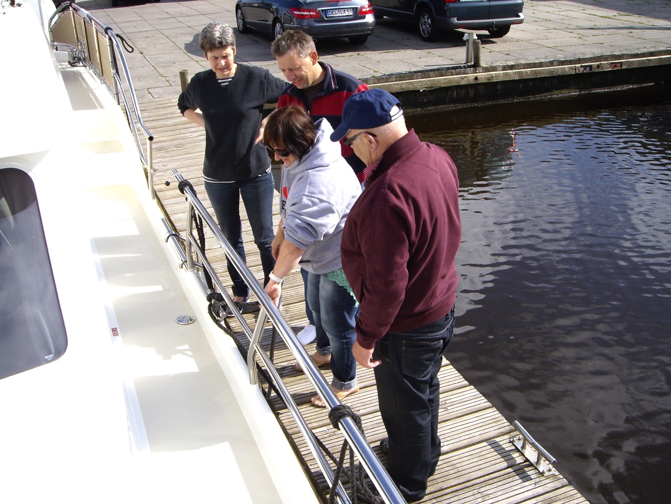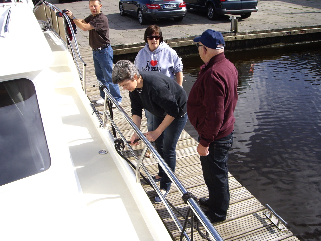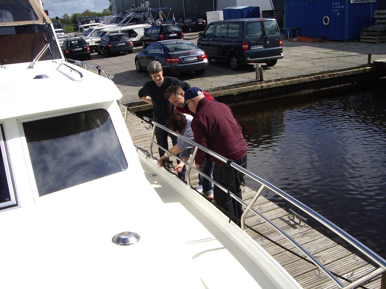 Nach einem herzhaften Frühstück auf dem Achterdeck bekamen wir die Einführung. Festmachen, An- und Ablegen wurde geübt.